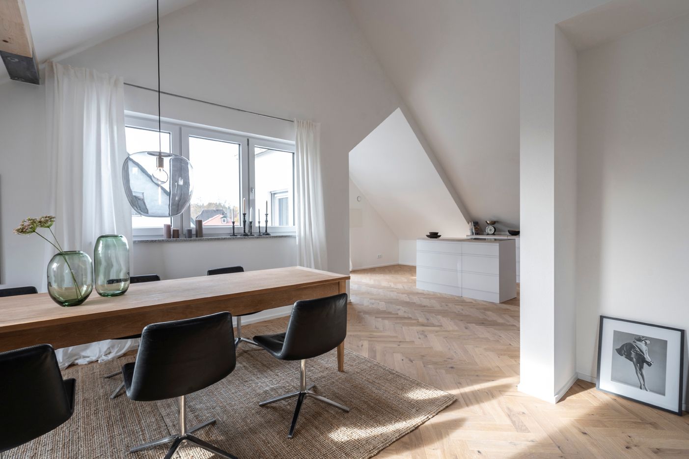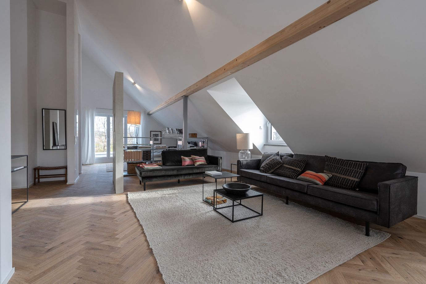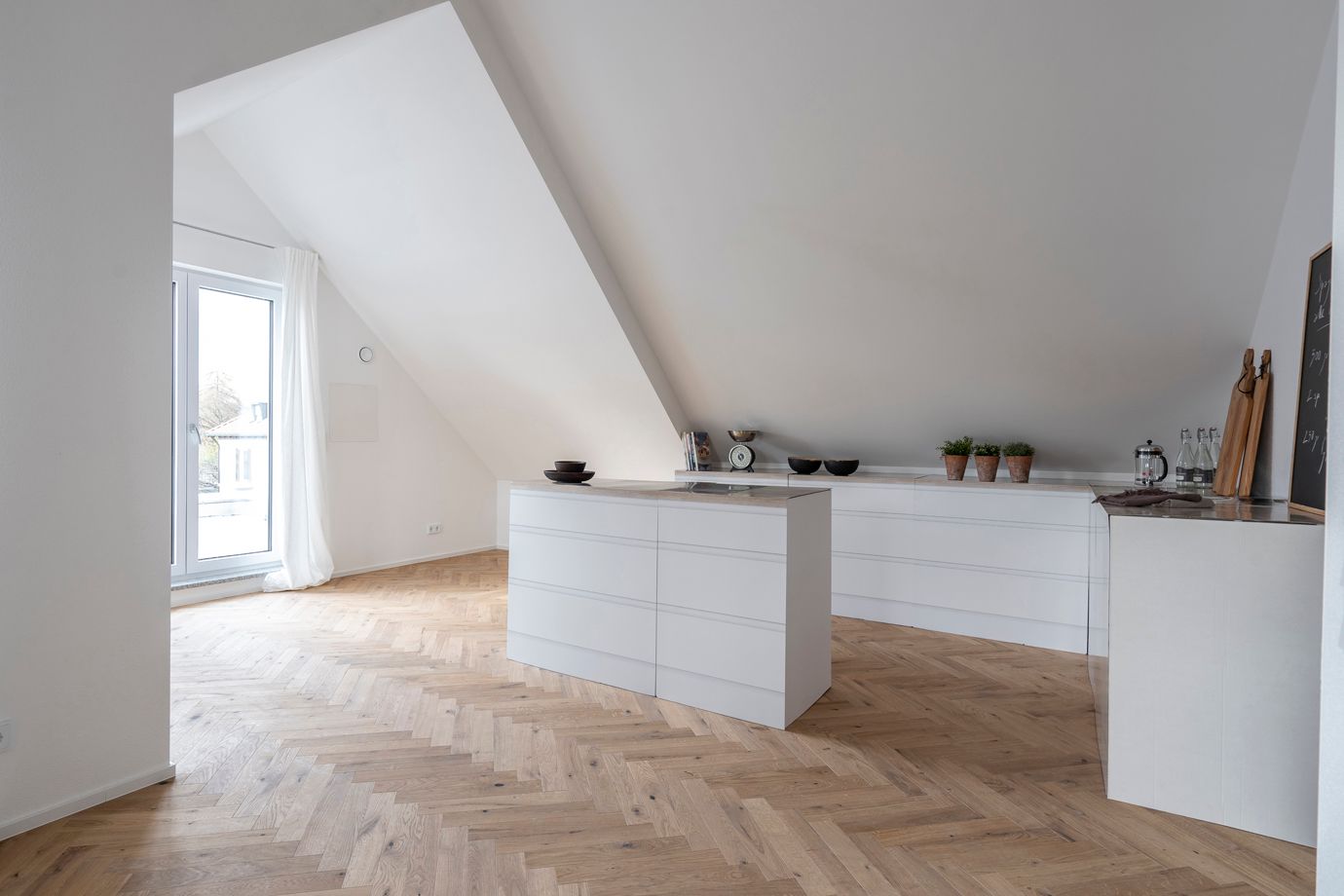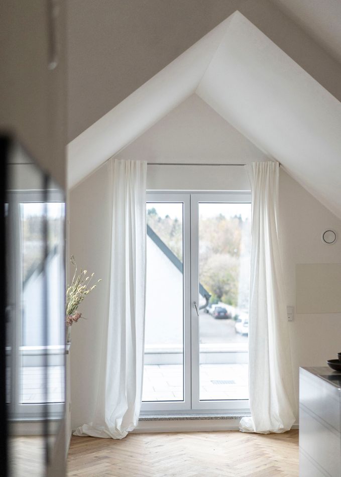 Die Wohnung hat einen großen Wohn-Essbereich mit offener Küche. Von der Küche der Zugang zur 8,77 m² großen Süd-West-Dachterrasse. Ein Schlafzimmer, ebenfalls mit kleinem Balkon. Badezimmer mit freistehender Wanne, großer Dusche & Fenster. Ein Gäste-WC ist vorhanden.