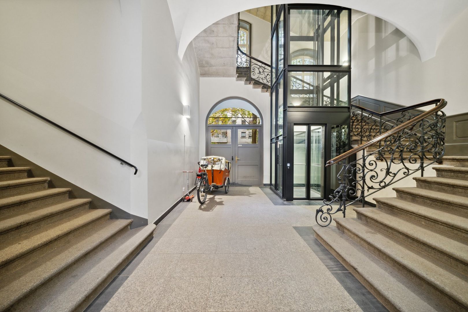 Gegenüberliegend der St. Lukas Pfarrkirche findet sich ein weiterer Hauszugang mit einem zweiten Treppenhaus. Dieses verfügt über einen verglasten Außenaufzug aus dem Jahre 2019.